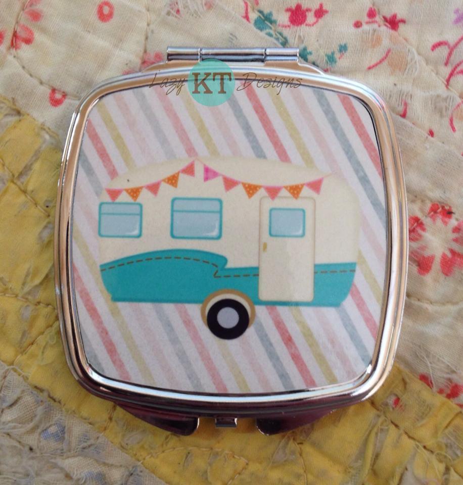 These adorable compacts are roughly 2.5"x2.5" and have two mirrors inside. Perfect for anyones purse, they make great stock stuffers, too.